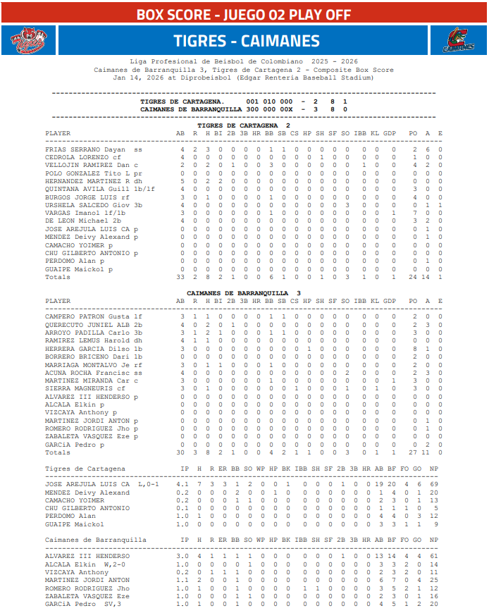 Caimanes de Barranquilla dio otro paso rumbo al título de la pelota profesional colombiana al derrotar la noche de este miércoles por pizarra de 3-2 a los Tigres de Cartagena en el segundo juego de la final, disputado en el estadio Édgar Rentería.