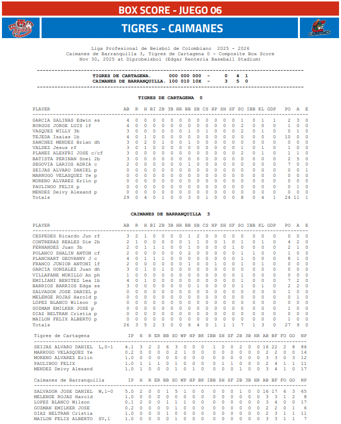 Apoyados en una defensa sólida y con una buena actuación de su pitcheo abridor, Caimanes de Barranquilla superó la noche de este domingo 3-0 a Tigres de Cartagena en el estadio Édgar Rentería para barrer la serie sobre ellos y consolidarse en la primera casilla del standing.