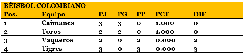 Caimanes y Toros, líderes del Standing del Béisbol Colombiano