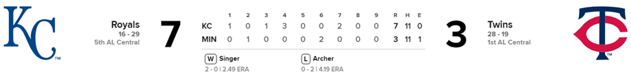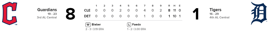 Kluber permitió una carrera y tres hits, no dio bases por bolas y ponchó a cinco, pero se fue sin decisión ya que el triunfo fue para el relevista J.P. Reyereisen (4-0).