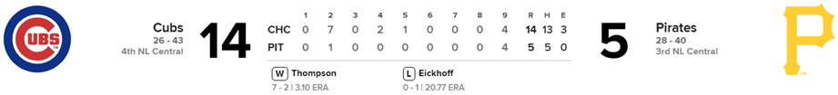 José Quintana, lanzador zurdo, abridor, lanzó 6.0 innings, enfrentó a 23 bateadores, hizo 83 lanzamientos, 53 en zona de strike, le conectaron 6 hits, entre ellos 1 tubey, le anotaron 2 carreras limpias, entregó 1 base por bolas y ponchó a 6, dejó el juego ganado, se fue sin decisión. (1-4 ERA 3.60, 61 K)