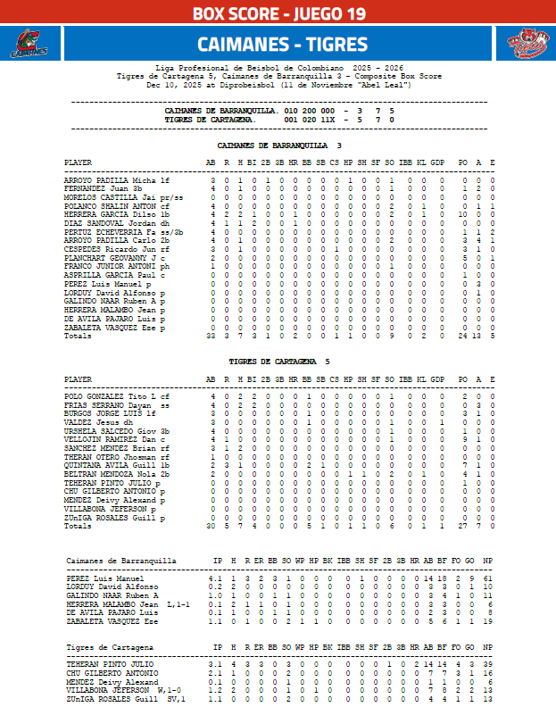 Caimanes de Barranquilla perdió la noche de este miércoles por pizarra de 5-3 ante los Tigres de Cartagena en el estadio Abel Leal Once de Noviembre del corralito de piedra, para sumar su segunda derrota en el campeonato.