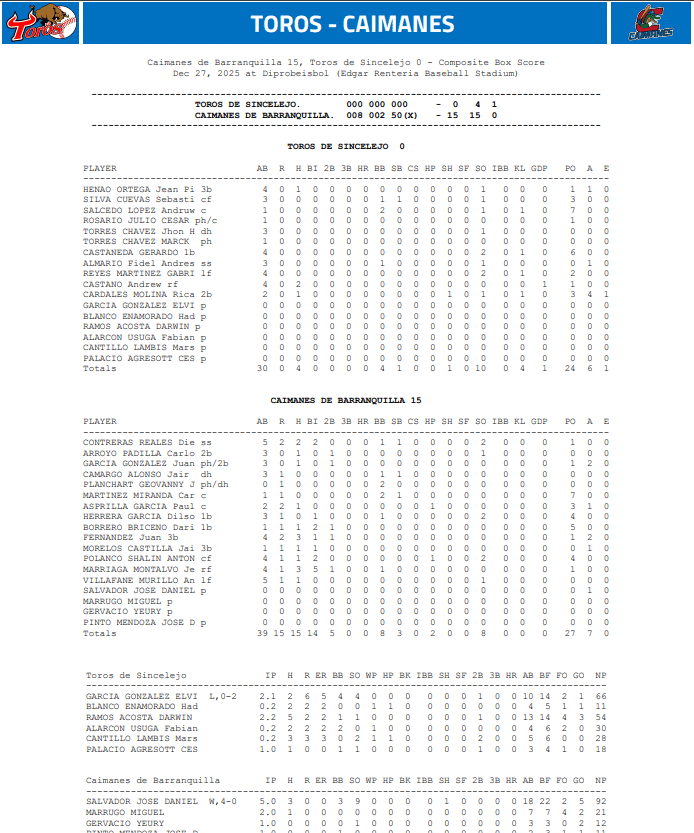 De otro lado, la derrota correspondió a Elvis García, quien en 2.1 de entradas le anotaron seis carreras, una de ellas sucia. Ponchó a cuatro rivales y entregó 4 bases por bolas.