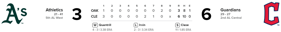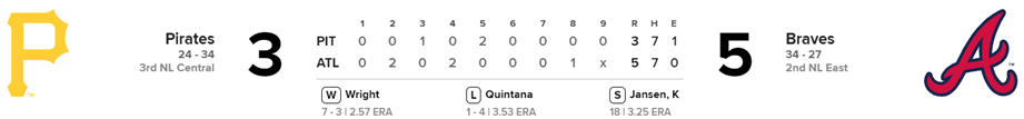 José Quintana, lanzador zurdo, abridor, trabajó en 5.0 inning, enfrentó a 22 bateadores, hizo 92 lanzamientos, 56 en zona de strike, le golpearon 6 hits entre ellos 2 tubeys y 3 jonrones, le anotaron 4 carreras limpias, entregó 1 base por bolas y ponchó a 4. (1-4 ERA 3.53, 50 K)