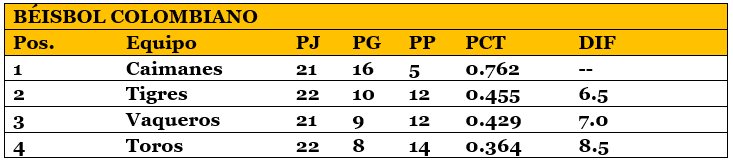 Standing LCBP, 1º Caimanes, 2º Tigres, 3º Vaqueros, 4º Toros