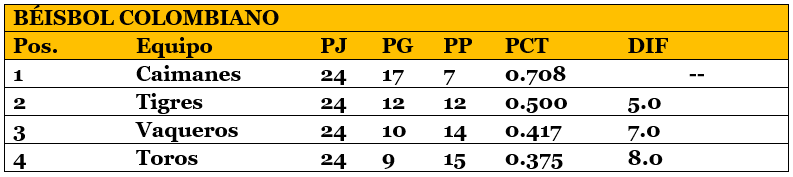 Standing LCBP, 1º Caimanes, 2º Tigres, 3º Vaqueros, 4º Toros