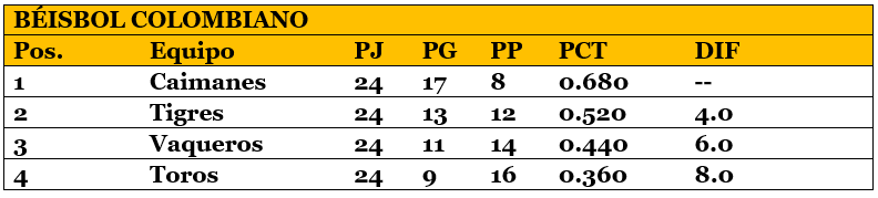 Standing LCBP, 1º Caimanes, 2º Tigres, 3º Vaqueros, 4º Toros