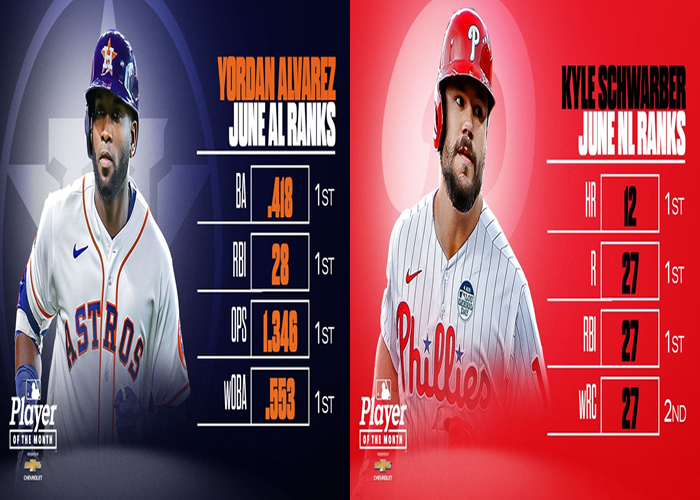 Los jugadores latinoamericanos arrasaron este sábado con los premios mensuales de junio en las Grandes Ligas, con destaque especiales del cubano Yordan Álvarez (Astros) por la Liga Americana y Kyle Schwarber (Filis) por la Nacional.