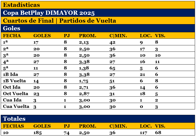 Cuartos de Final, 185 goles en 74 partidos, 1 gol cada 36 minutos