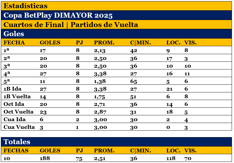 Cuartos de Final, 188 goles en 75 partidos, 1 gol cada 36 minutos