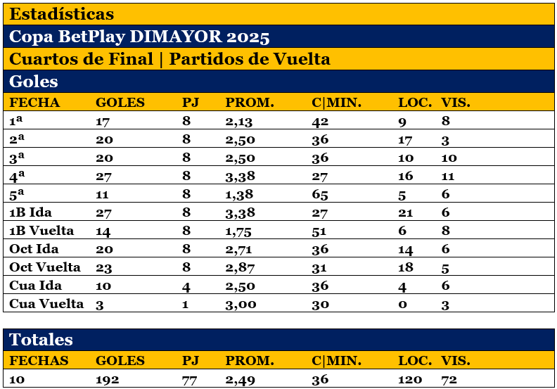 Cuartos de Final, 192 goles en 77 partidos, 1 gol cada 36 minutos