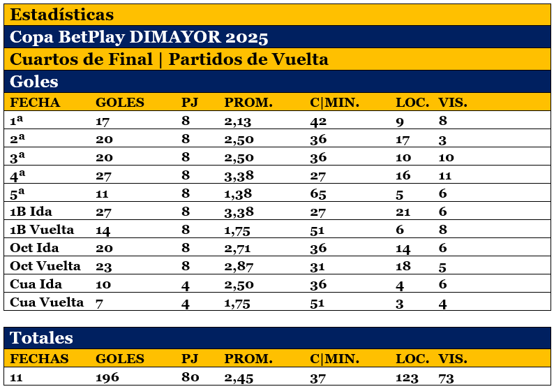 Cuartos de Final, 196 goles en 80 partidos, 1 gol cada 37 minutos