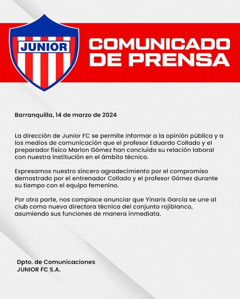 Junior de Barranquilla anunció que Yinaris García volverá a dirigir al plantel femenino de cara a la Liga que se disputa. García reemplzará al DT Eduardo Collado.