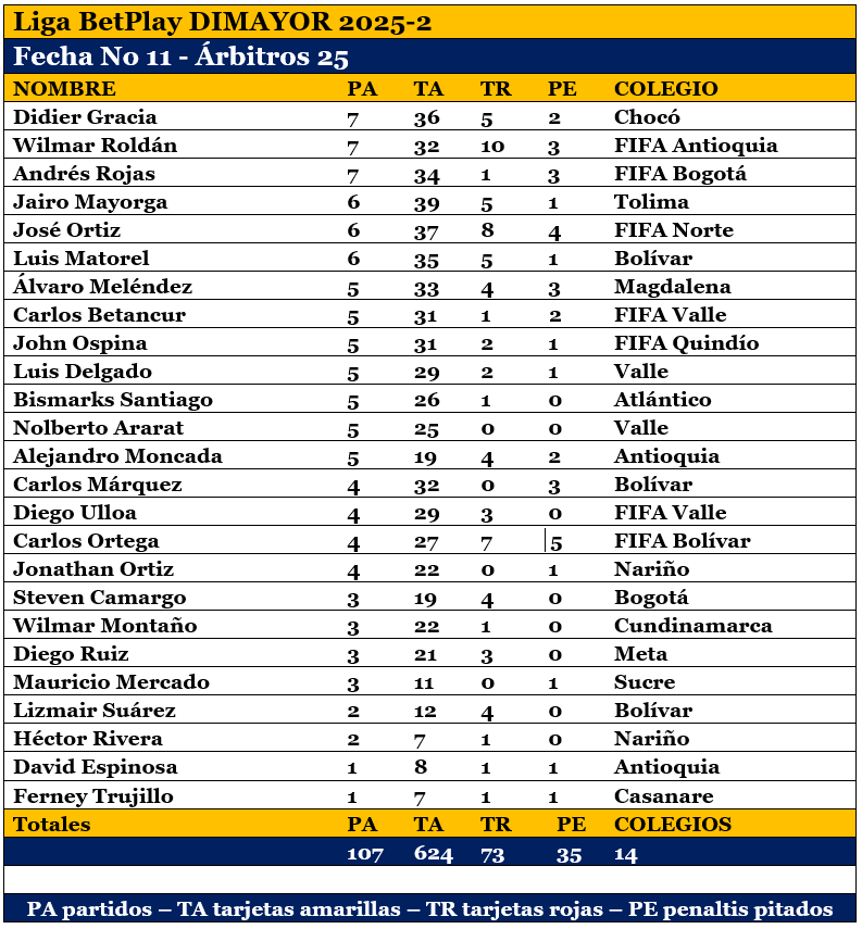 25 Árbitros, 624 tarjetas amarillas, 73 rojas y 35 penaltis