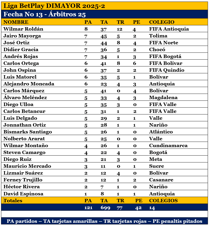 25 Árbitros, 699 tarjetas amarillas, 77 rojas y 42 penaltis