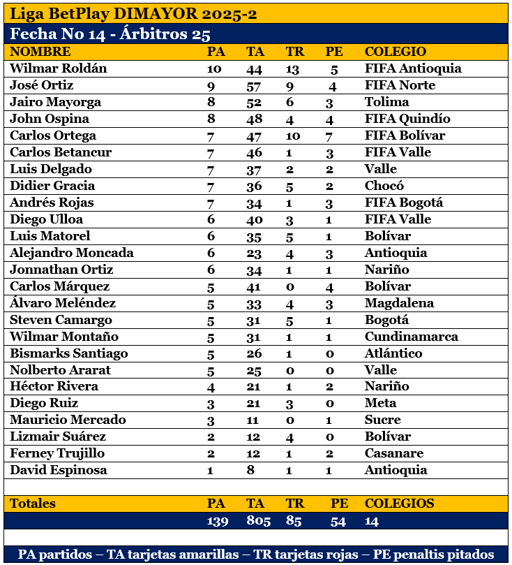 25 Árbitros, 805 tarjetas amarillas, 85 rojas y 54 penaltis