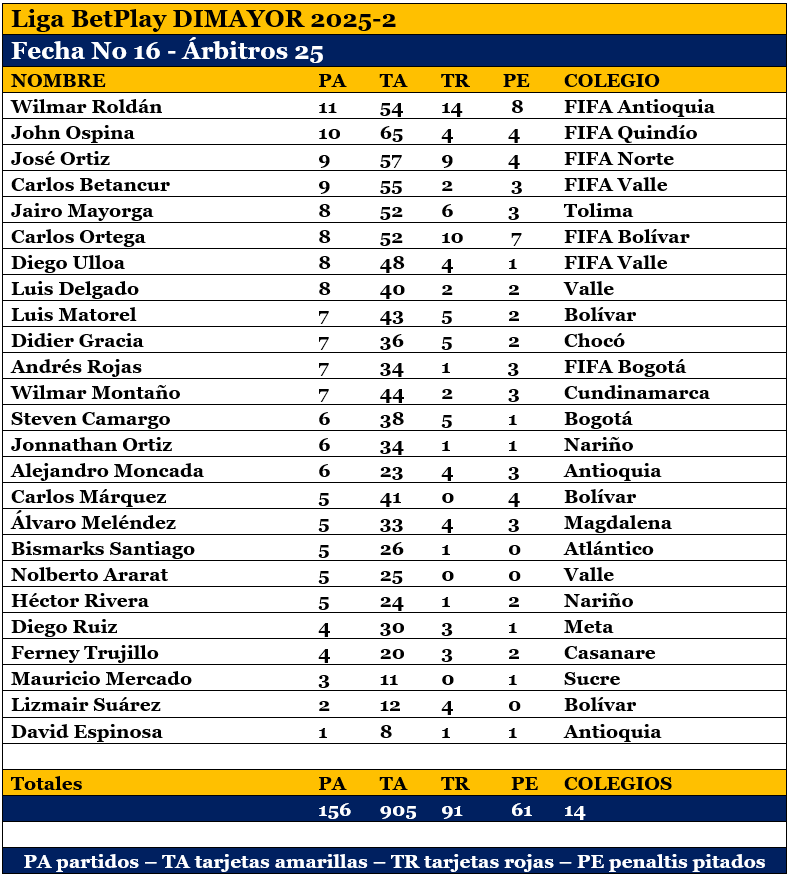 25 Árbitros, 905 tarjetas amarillas, 91 rojas y 61 penaltis
