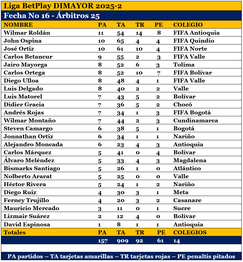 25 Árbitros, 909 tarjetas amarillas, 92 rojas y 61 penaltis