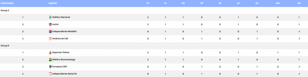 En el Grupo A, Deportes Tolima es líder por la ventaja deportiva.