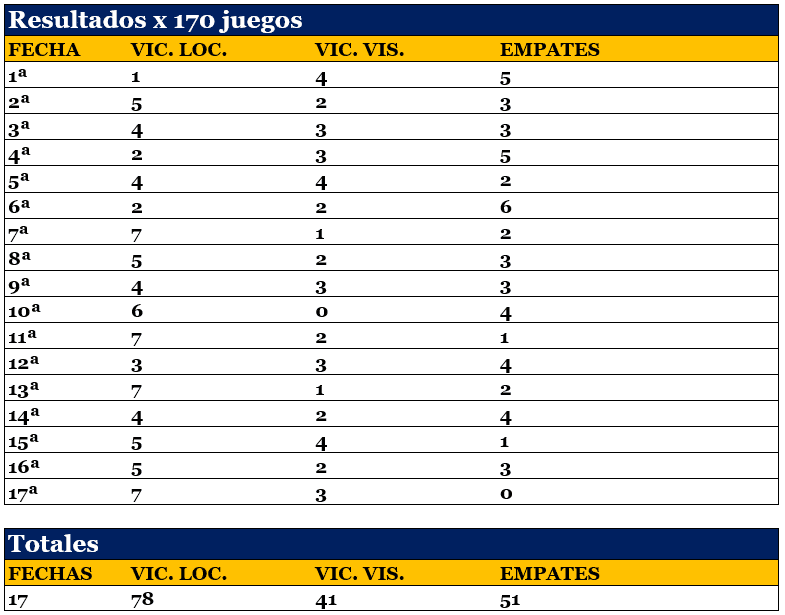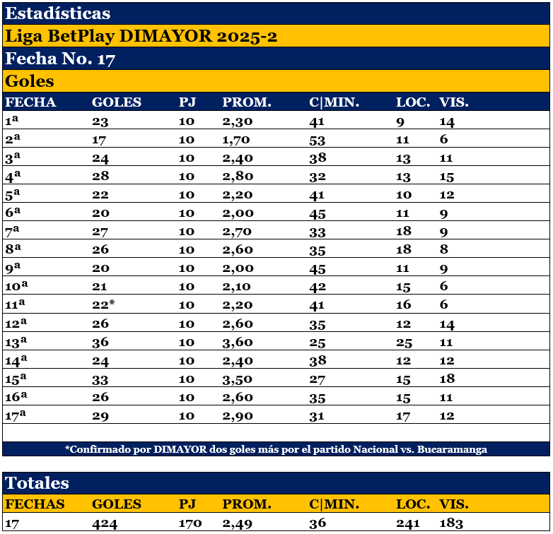 En 17 fechas, 424 goles en 170 partidos, 2,49 por juego