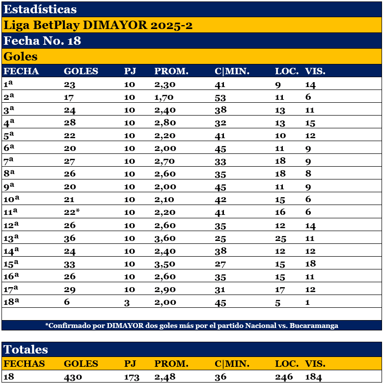En 18 fechas, 430 goles en 173 partidos, 2,48 por juego