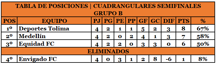 Deportivo Independiente Medellín es líder del Grupo B en los Cuadrangulares Semifinales. En el segundo lugar está Deportes Tolima y tercero Equidad FC. Envigado FC fue el primer equipo en quedar eliminado de cualquier opción de llegar a la final.