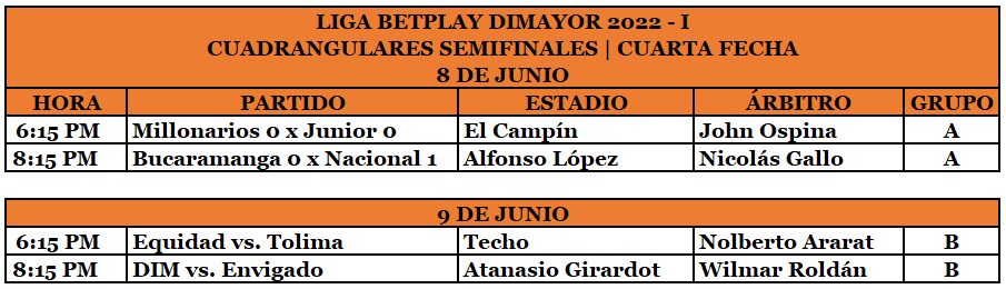 Este jueves terminará la cuarta fecha de los Cuadrangulares Semifinales de la Liga Betplay 2022 – I con los partidos del Grupo B. A las 6:15 PM, Deportivo Independiente Medellín recibirá a Envigado FC en el Estadio Atanasio Girardot. La jornada terminará con el partido entre Equidad FC vs. Deportes Tolima en el Estadio Metropolitano de Techo a las 8:15 PM. Todos con transmisión de WIN Sports +.