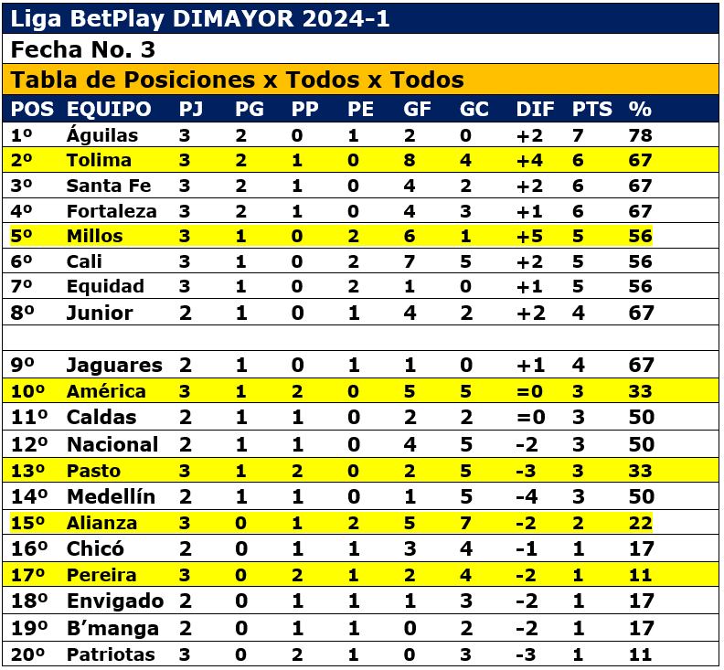 Las posiciones, 1º Águilas, 8º Junior, 14º Medellín