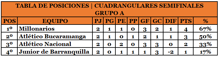 Millonarios FC es el líder del Grupo A en los Cuadrangulares Semifinales. El cuadro dirigido por Alberto Gamero suma 4 puntos (1 victoria y 1 empate). En el segundo lugar está Atlético Bucaramanga con 3 puntos (1 victoria y 1 derrota). Tercero Atlético Nacional y cuarto Junior de Barranquilla.