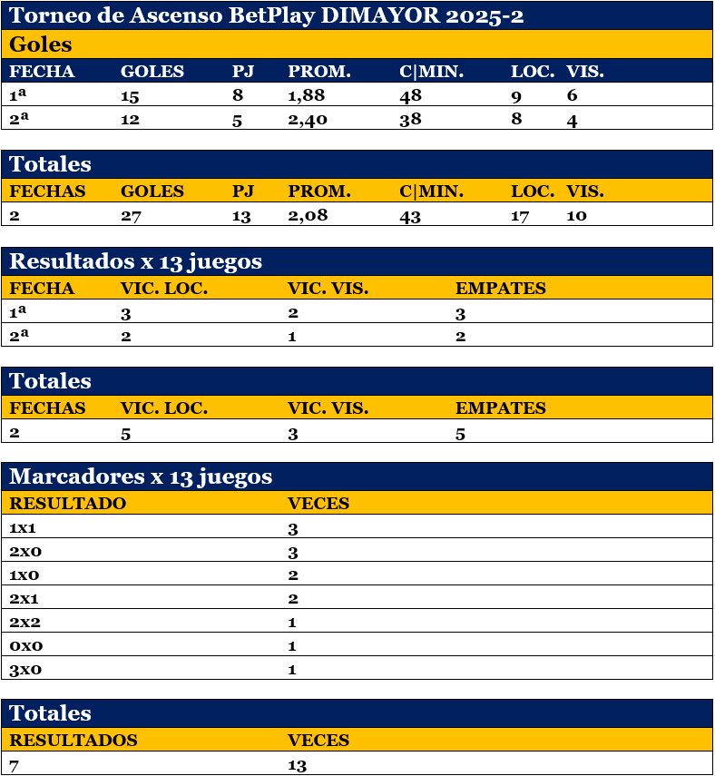 2ª fecha, 27 goles en 13 partidos, promedio 2,08