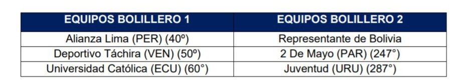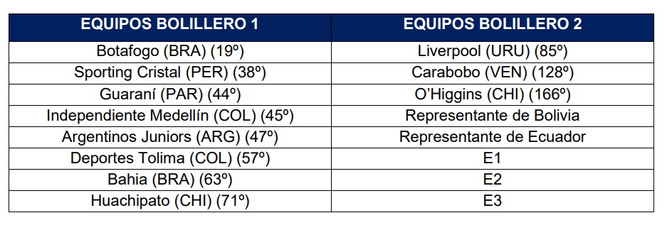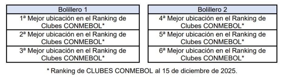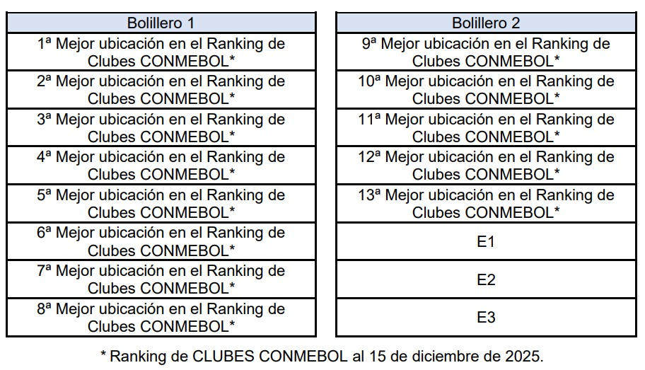 Los equipos que conformarán cada bolillero estarán distribuidos de acuerdo a sus ubicaciones en el Ranking de CLUBES CONMEBOL al 16 de diciembre de 2024.