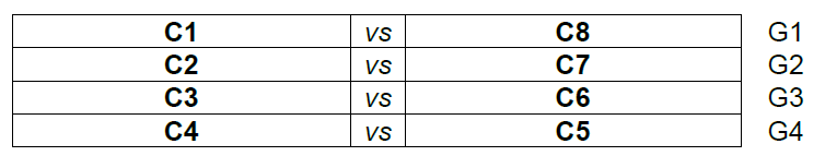 Se utilizará el mismo sistema para establecer las demás llaves. Los ganadores de estas llaves clasificarán para la Fase 3, los que tendrán por nombre C1, C2, C3, C4, C5, C6, C7 y C8.