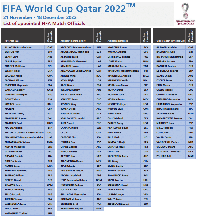 Seis mujeres figuran por primera vez entre los 105 árbitros de la próxima Copa del mundo masculina de fútbol en Catar, anunció el jueves la FIFA.