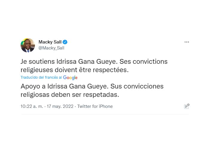 “Apoyo a Idrissa Gana Guèye. Sus creencias religiosas deben ser respetadas”, declaró el presidente Sall.