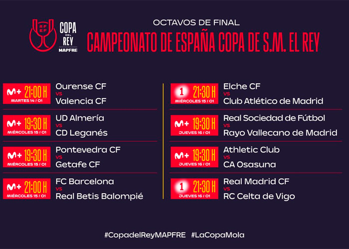La eliminatoria, a partido único, de octavos de final de la Copa del Rey se disputará del 14 al 16 de enero.