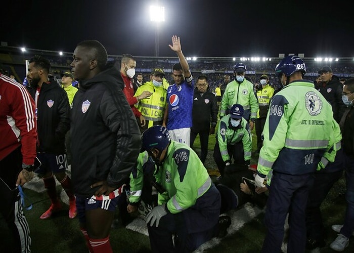 Cuando terminó el partido. Tanto jugadores del Junior como el cuerpo arbitral nuevamente fueron agredidos por la hinchada azul. En imágenes recopiladas por la agencia Colprensa y reseñada por varios usuarios en redes sociales, se ve a la Policía Nacional sacando a los antes mencionados protegidos con escudos ante los ataques con botellas. Incluso, se ve en el suelo a Juan Manuel Lopez, el asistente técnico del Junior mientras que el capitán de Millonarios, David Macalister Silva, llamaba a la calma.