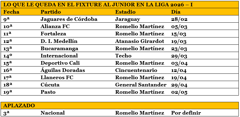 Al Junior de Barranquilla le quedan por jugar 12 partidos en la presente Liga Betplay 2026 – I del fútbol colombiano. De esos partidos, 7 son de local en el Estadio Romelio Martínez, entre ellos uno aplazado vs. Atlético Nacional de la 3ª fecha, y 5 en condición de visitante.