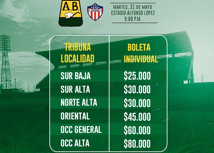 La boletería para el partido entre Atlético Bucaramanga y Junior de Barranquilla, que se jugará este martes a las 6:00 PM en el Estadio Alfonso López, ya está a la venta.