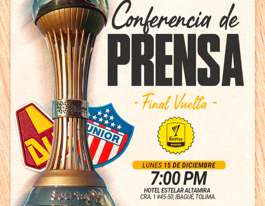 La División Mayor del Fútbol Colombiano – DIMAYOR informa que este lunes 15 de diciembre a las 7:00 p.m. se realizará la conferencia de prensa oficial previa al partido de Vuelta de la Final de la Liga BetPlay DIMAYOR II-2025 entre Deportes Tolima vs. Junior FC.