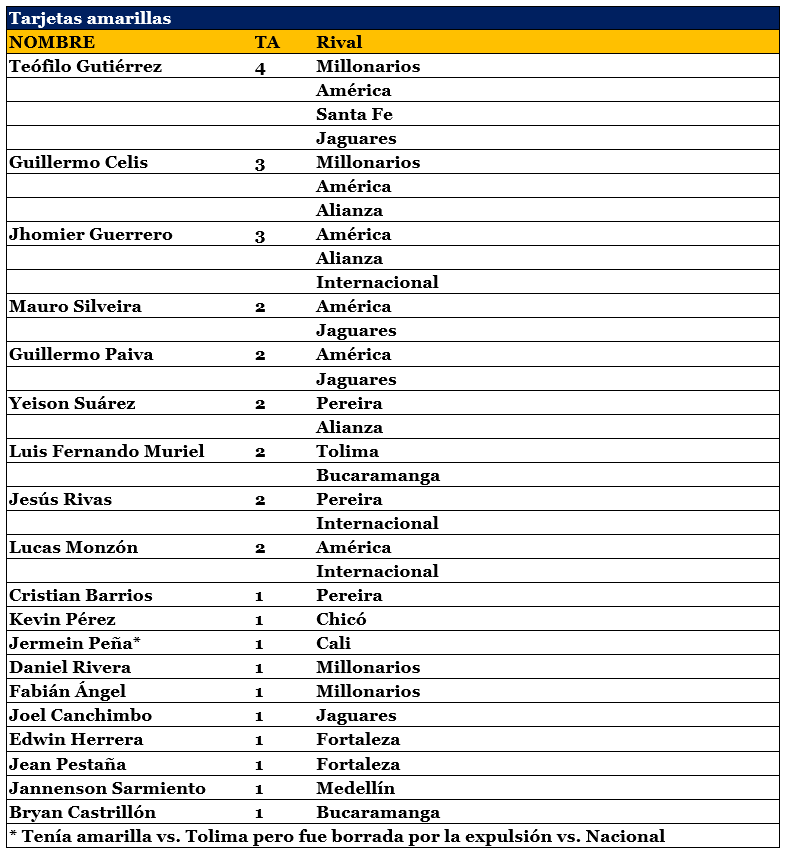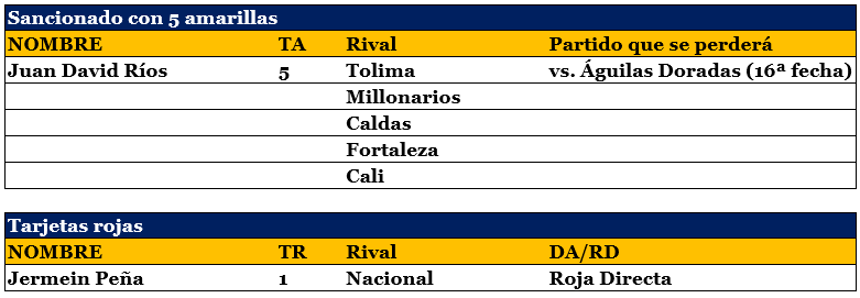 Juan David Ríos fue amonestado a los 4’ del PT en el partido vs. Deportivo Cali, acumulando 5 amarillas y deberá pagar fecha de suspensión.