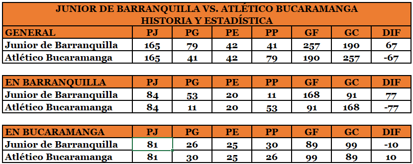 Junior de Barranquilla y Atlético Bucaramanga jugarán el partido No. 166 en la historia de la primera división del fútbol profesional colombiano. El balance favorece al Junior en los 165 compromisos anteriores: 79 triunfos, 42 empates, 41 derrotas, 257 goles a favor y 190 en contra.