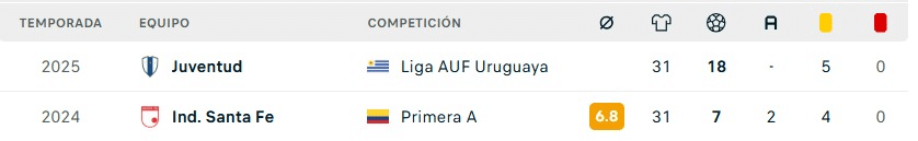 En el 2025, jugó con Juventud de Uruguay 31 partidos y anotó 18 goles.