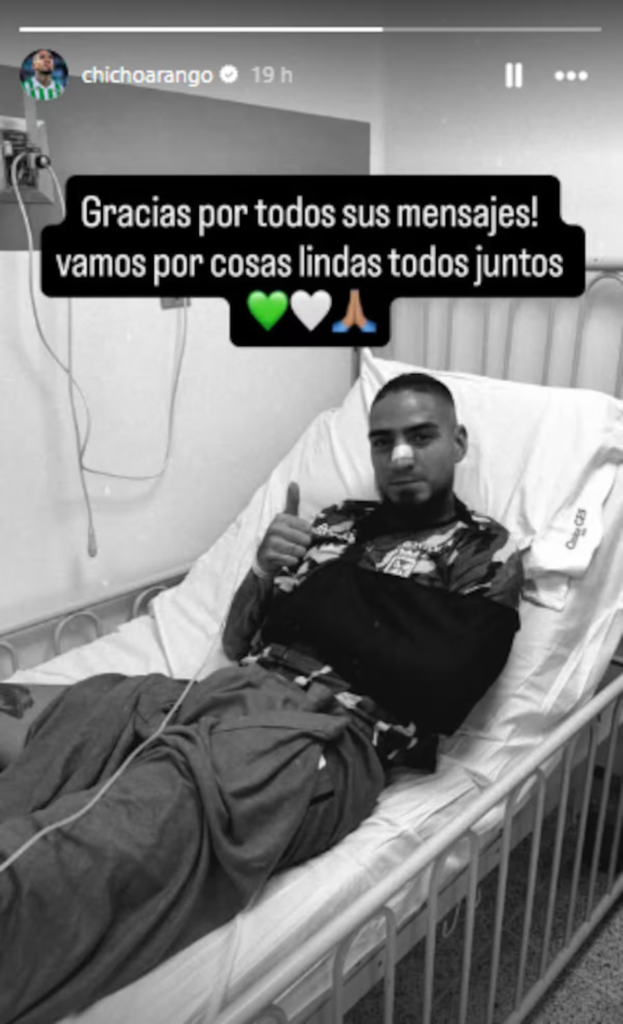 Se trata de Cristian “Chicho” Arango. El delantero verdolaga tuvo un durísimo choque con Diego Hernández, defensor de Águilas Doradas, en partido disputado el sábado anterior. “Chicho” perdió el conocimiento, posteriormente lo recobró y luego fue trasladado a un centro asistencial de la capital antioqueña con el brazo izquierdo inmovilizado.