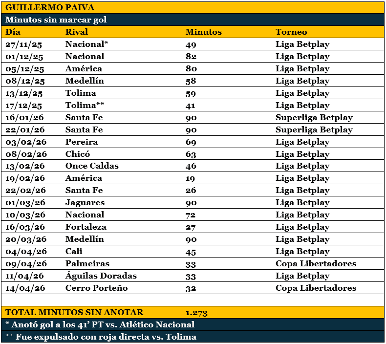 En minutos, suma 1.273 sin anotar (1028 en Liga, 180 en Superliga y 65 en Libertadores).