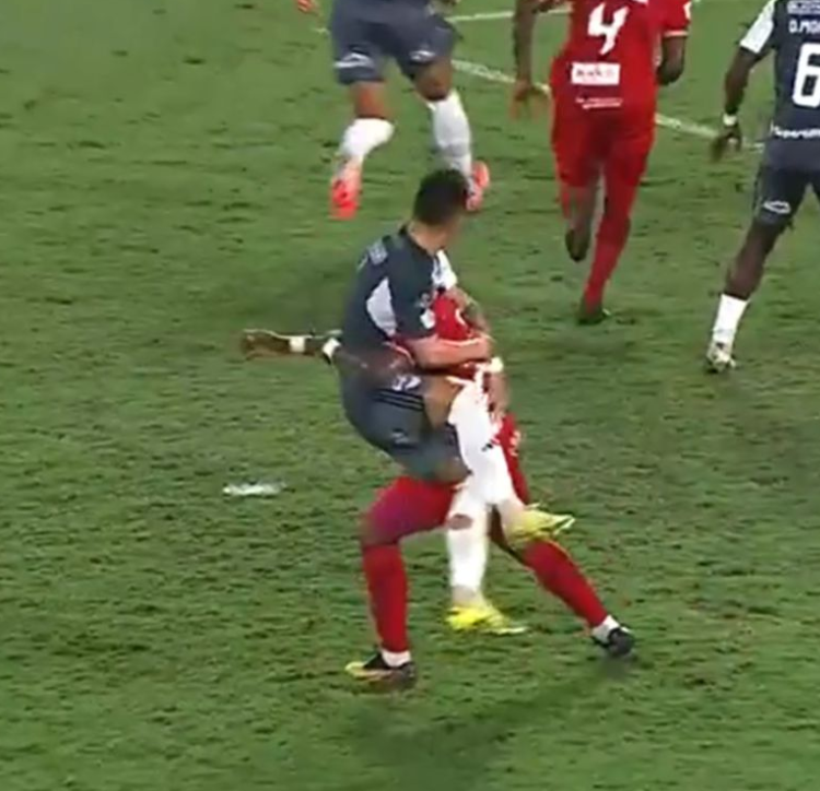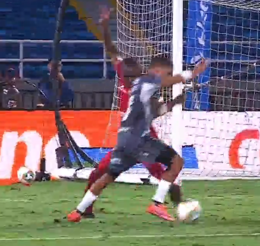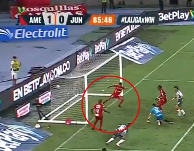 La primera se dio a los 37’ del PT. En un forcejeo entre Guillermo Paiva (Junior de Barranquilla) y Jean Pestaña (América de Cali). El jugador escarlata agarró al delantero Tiburón, lo que evitó que Paiva se pudiera mover en el área.