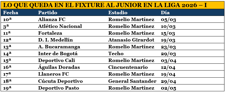Esto es lo que queda del Fixture de la Liga Betplay 2026 – I para Junior de Barranquilla.