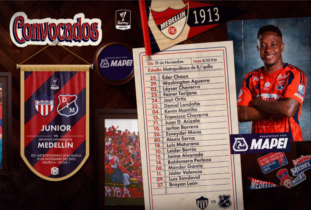 20 jugadores fueron convocados por el DT Alejandro Restrepo para afrontar el partido vs. Junior de Barranquilla por la 1ª fecha de los Cuadrangulares Semifinales de la Liga Betplay 2025 – II.