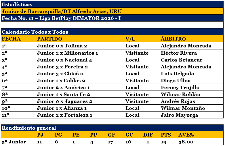 Rendimiento Junior de Barranquilla, 19 puntos de 33 – 58,00%