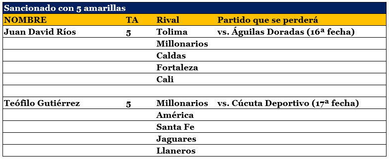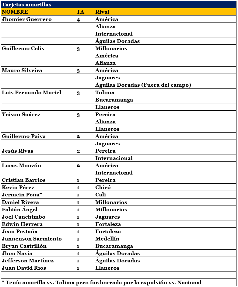 El delantero fue amonestado en el partido vs. Llaneros y llegó a 5 amarillas, por lo que aparecerá reportado en el Boletín de Sanciones de DIMAYOR.