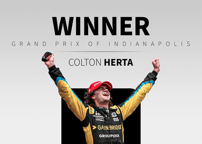 El piloto estadounidense Colton Herta (Andretti Autosport) logró el sábado su primer triunfo de la temporada en la serie IndyCar al imponerse en el GMR Grand Prix de Indianápolis, donde la fuerte lluvia hizo estragos con retrasos y abandonos.